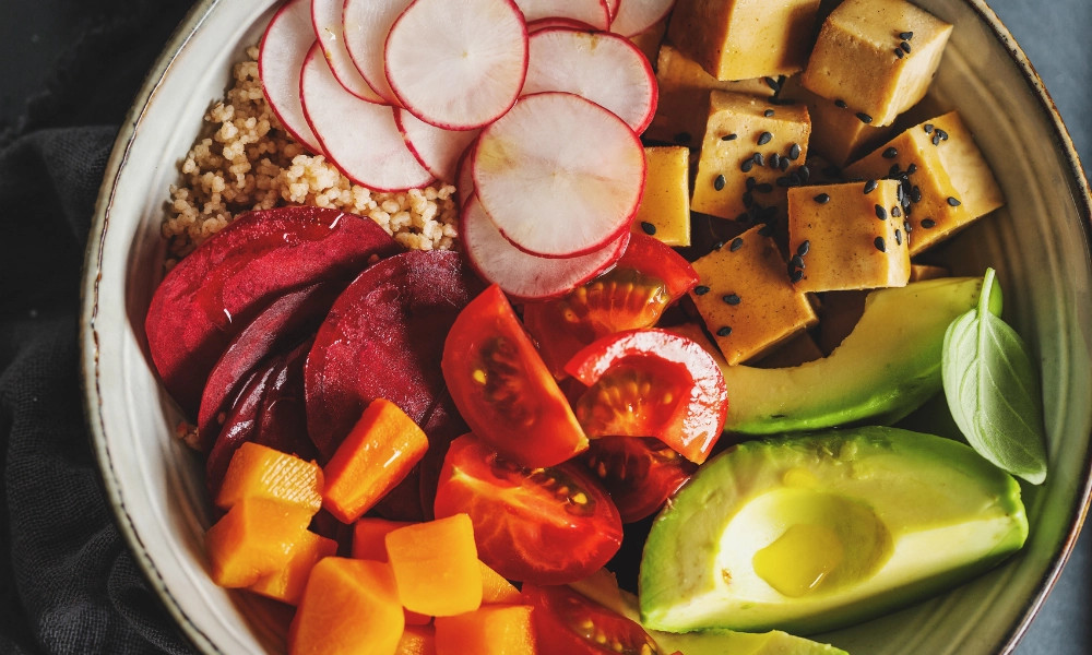 Chế độ ăn chay tập trung vào rau củ quả, trái cây, các loại hạt, đậu, ngũ cốc nguyên cám, và các sản phẩm thay thế từ thực vật. Hãy ưu tiên các loại thực phẩm giàu protein như đậu nành, đậu lăng, hạt quinoa, nấm, và các loại đậu khác để đảm bảo cơ thể nhận đủ protein.