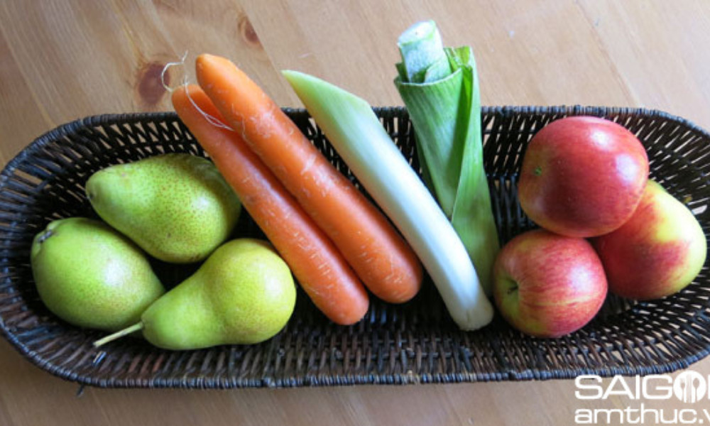 Rửa sạch lê, táo, boaro và cà rốt. Chẻ lê, táo và boaro làm 3-4 miếng. Cho tất cả vào nồi, đổ nước ngập mặt nguyên liệu, đun sôi rồi hạ nhỏ lửa hầm trong khoảng 1-2 tiếng cho đến khi nước dùng ngọt thanh. Sau khi hầm xong, lọc bỏ bã, giữ lại phần nước dùng trong.